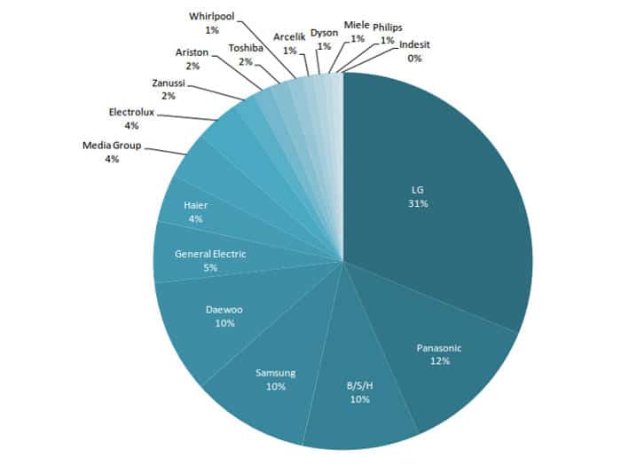 La que más patentes tiene de electrodomésticos para el hogar con diferencia es LG, con un 32%; seguida de Panasonic con un 12%; y Samsung, BSH y Daewoo con un 10%.