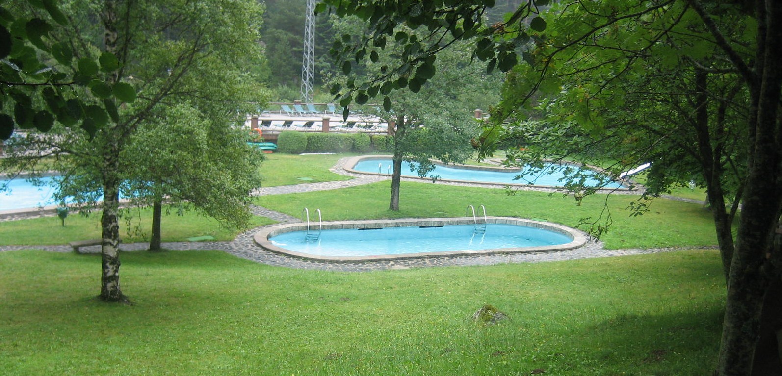Otro sitio que vale la pena visitar es el balneario Caldes de Boí. Es un complejo turístico montado en torno a las 37 fuentes de agua que mana a temperaturas entre cuatro y cincuenta y seis grados y que tiene propiedades terapéuticas sobre todo para tratar enfermedades cutáneas y reuma. Está situado al final de la carretera que sube por el valle, donde el rio se llama rio Caldes antes de tomar el nombre de Ribera de Tor. El complejo turístico está enclavado en un bonito parque natural y está compuesto por un hotel de cuatro estrellas, un conjunto de humeantes piscinas al aire libre, el balneario propiamente dicho y un hotel, menos moderno y más modesto, hotel Caldas, que ocupa parte de un edificio singular del siglo XVII en cuyo centro hay un patio porticado al que dan algunas tiendas de venta de productos artesanales y desde el que se accede al Santuario en el que se venera a la Virgen de Caldes. En el restaurante de este hotel entramos a comer pues está abierto también a los no huéspedes. Nos acogieron en el lateral de un gran comedor con suelo de madera que crujía continuamente al paso de los camareros que servían las mesas. Nos ofrecieron el mismo menú del día que a los huéspedes del hotel pero nos defraudó bastante ya que el menú, ensalada de pasta y pollo, parecía más propio de un colegio internado que de un hotel. Al terminar de comer y antes de iniciar el regreso caminamos un poco por los jardines del complejo turístico, protegidos bajo un paraguas pues había comenzado a caer una lluvia muy fina. El aspecto grisáceo que tomó el cielo hizo resaltar, más aún, los colores de las flores que adornaban el parque.